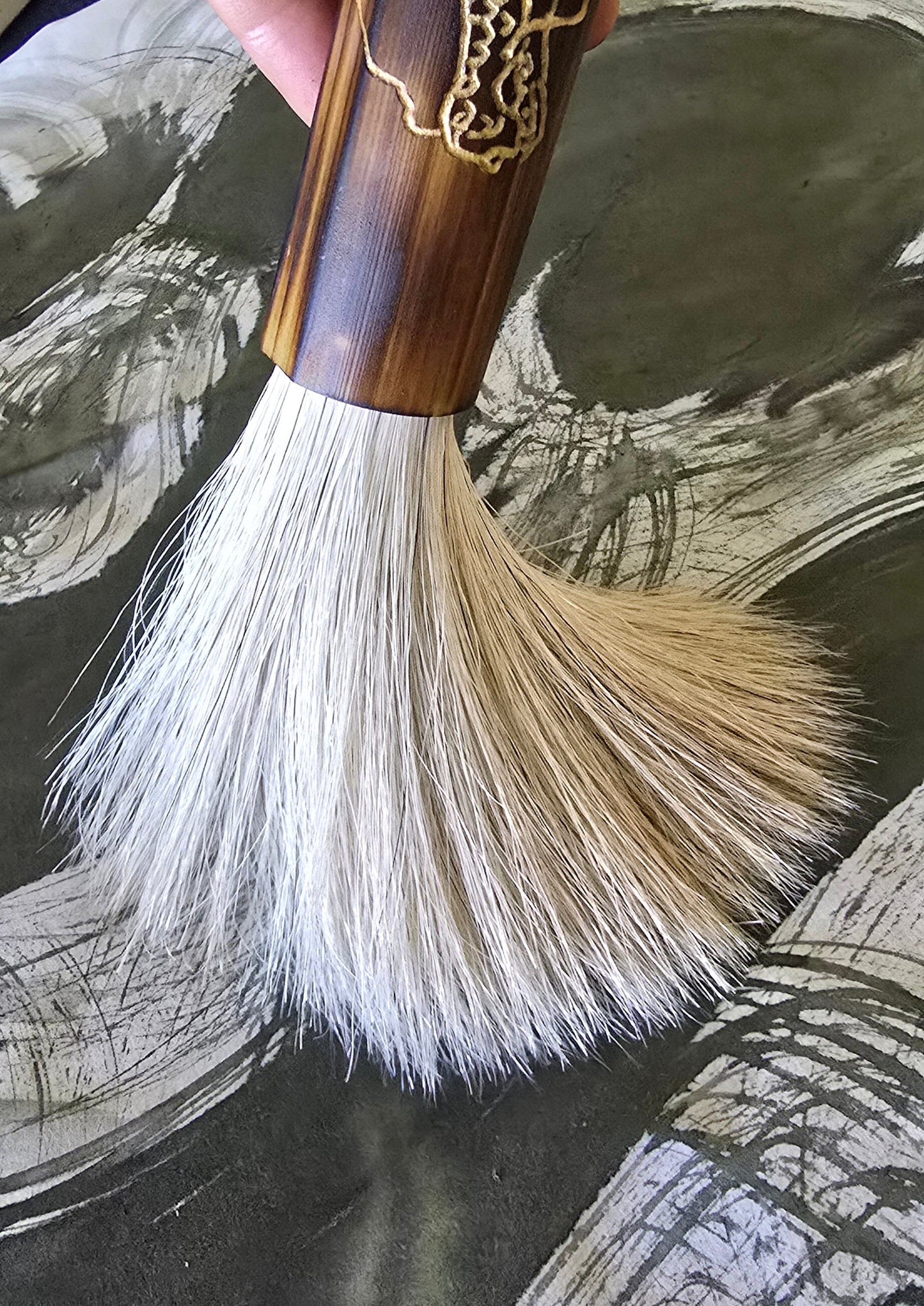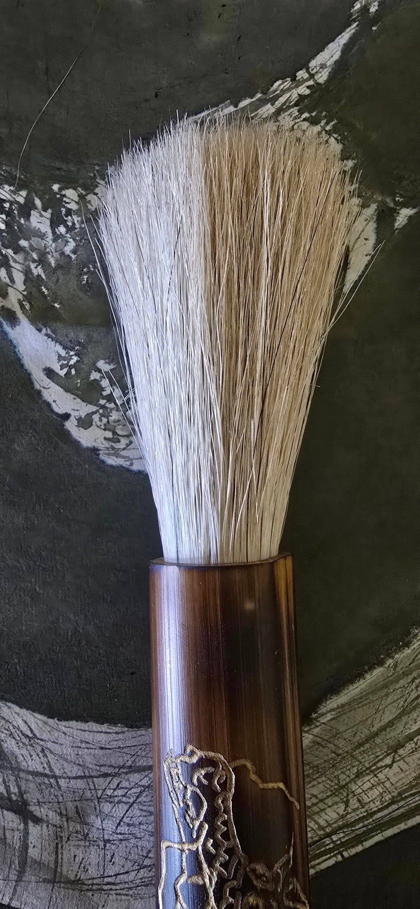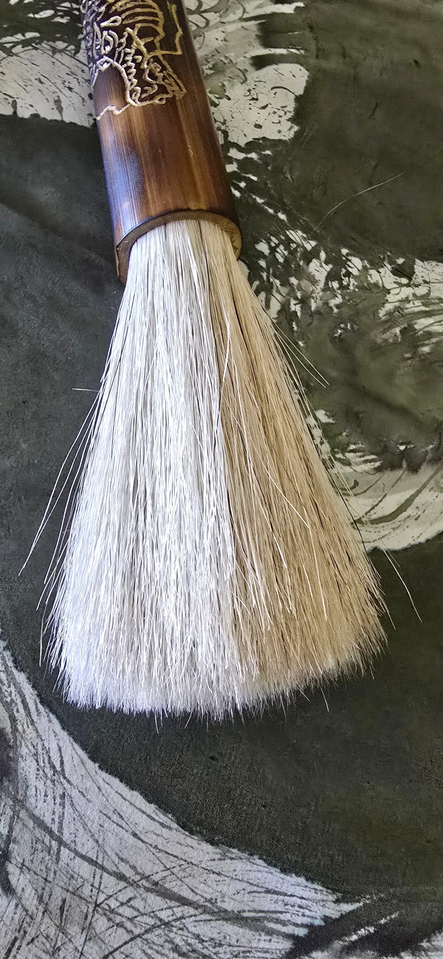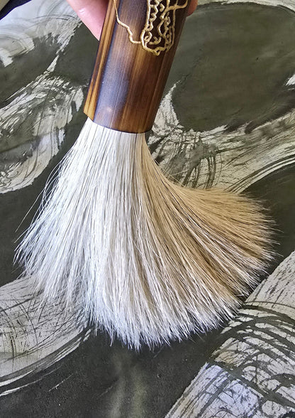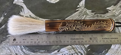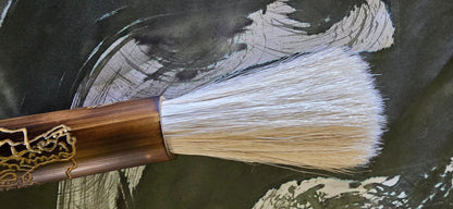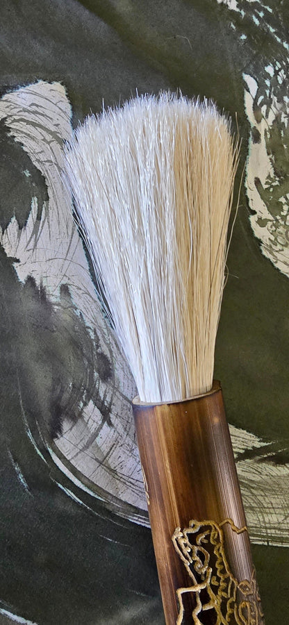 This handcrafted Sumi-e brush features a bamboo handle etched with a dragon design, offering both visual impact and a comfortable grip. The bristles are made from a premium white-color horsehair, naturally tapered to fine points for expressive mark-making and smooth paint flow.